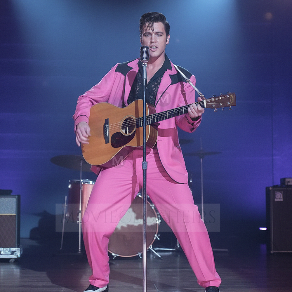 This pink and black suit draws directly from the unforgettable moment in Baz Luhrmann’s Elvis, where Austin Butler performs in the iconic look, channeling the charisma and raw style of Elvis Presley. The color contrast and sharp tailoring became a symbol of Presley’s rise and his flair for flamboyant fashion.