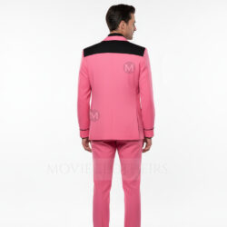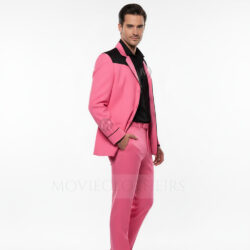 Channel iconic rock ‘n’ roll energy with this Elvis pink suit, a bold recreation of the hot pink and black outfit made famous by Austin Butler’s Elvis outfits in the 2022 biopic. Tailored in a striking blend of hot pink fabric with deep black peak lapels, this two-piece hot pink and black suit revives the rebellious 1950s spirit with modern edge. Designed with a slim fit, padded shoulders, and high-rise trousers, it mirrors the electrifying charm that turned heads in both Elvis Presley’s early performances and the film’s Beale Street scenes.