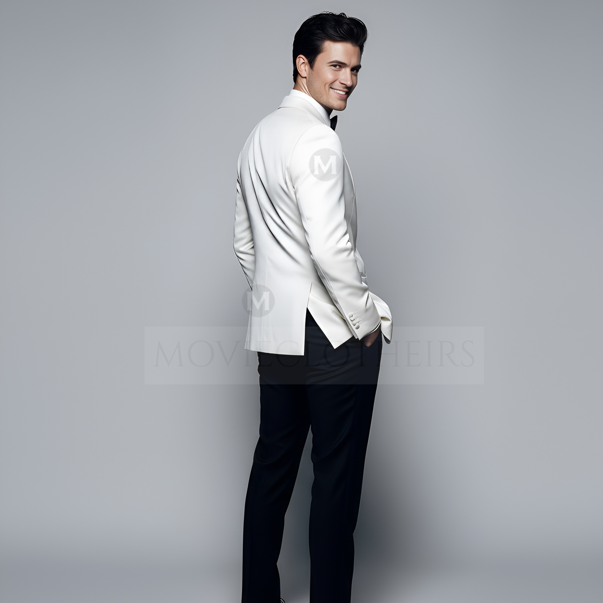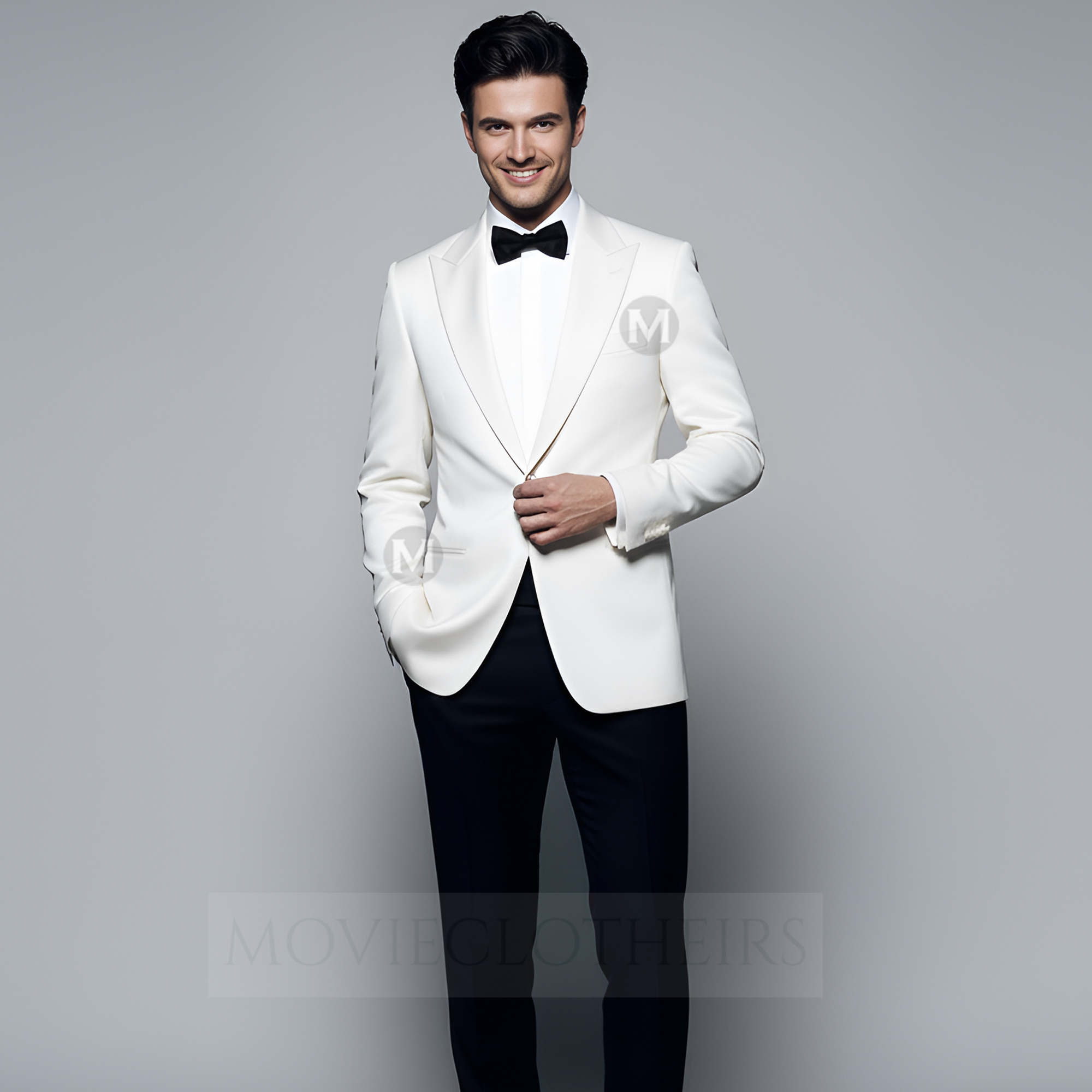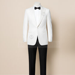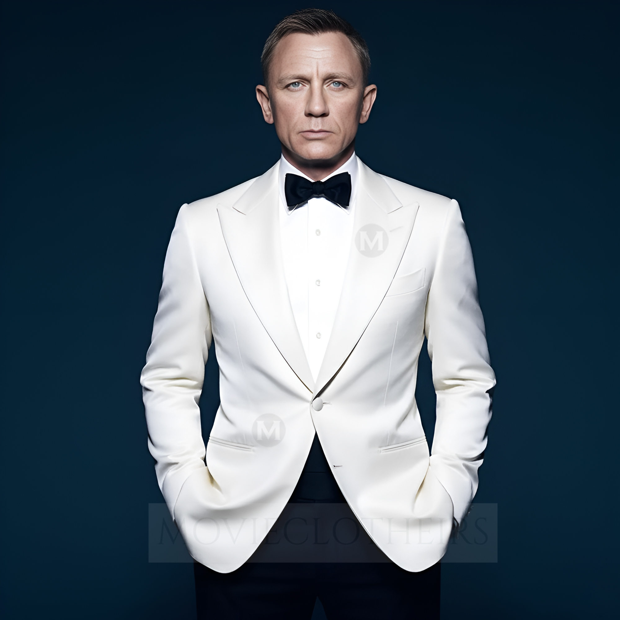 To channel the suave energy of the Daniel Craig white tuxedo, pair the jacket with black tuxedo trousers, a crisp white dress shirt with pleats, a black silk bow tie, and glossy black patent leather shoes. Don’t forget the finishing touch — a white pocket square for added Bond-level polish.